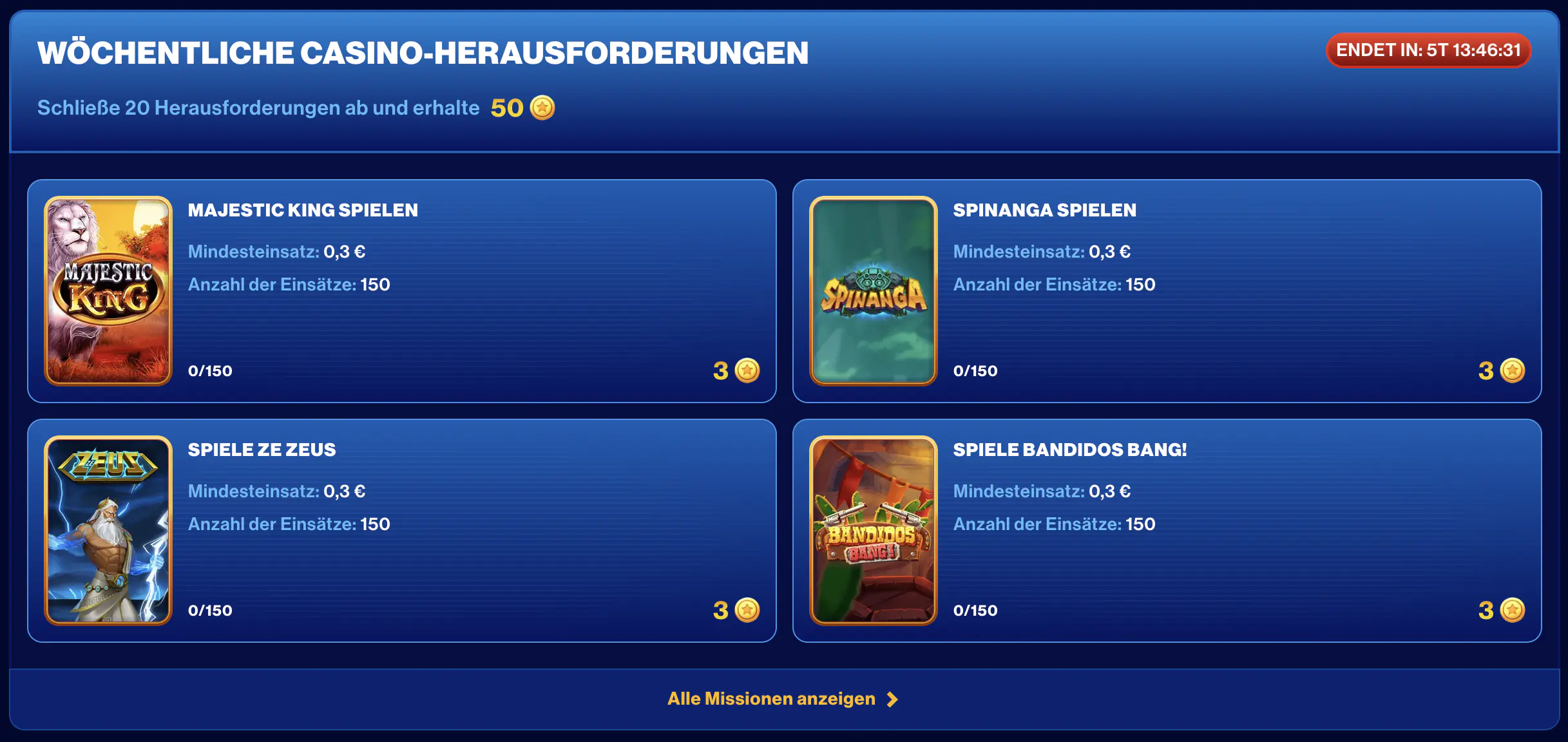 Bei Spins of Glory können Spieler an regelmäßig wechselnden Herausforderungen teilnehmen, die bestimmte Ziele setzen. So kann eine Aufgabe beispielsweise verlangen, eine festgelegte Anzahl Spins auf bestimmten Spielautomaten zu absolvieren oder eine spezielle Gewinnkombination zu erzielen.