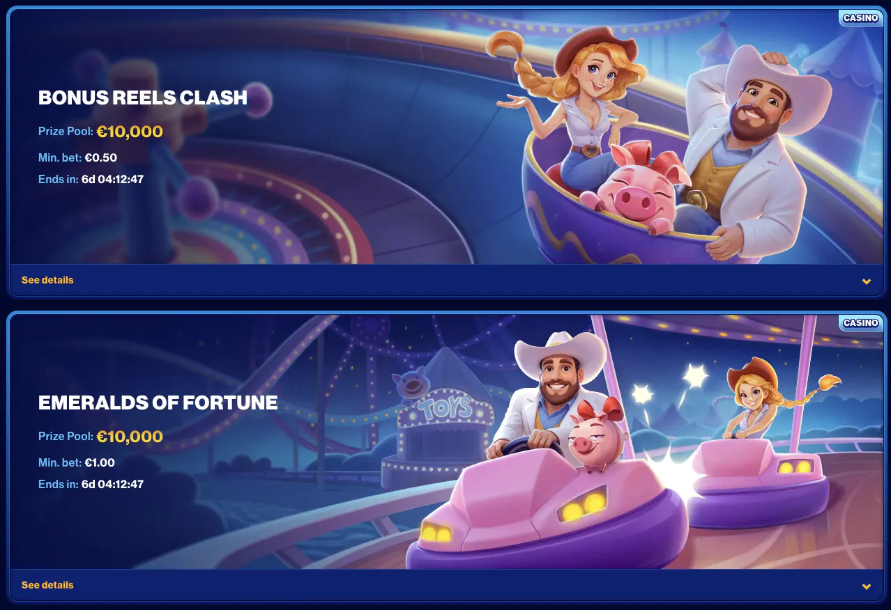 Die erfolgreichsten Spieler erhalten Preise wie Bonusgeld, Casino-Freispiele oder Sachpreise. Ein konkretes Beispiel: Im wöchentlichen Slot-Turnier kann der Gewinner des ersten Platzes 200 € Bonus erhalten, während Platz 2 noch 100 € und Platz 3 Freispiele bekommt.